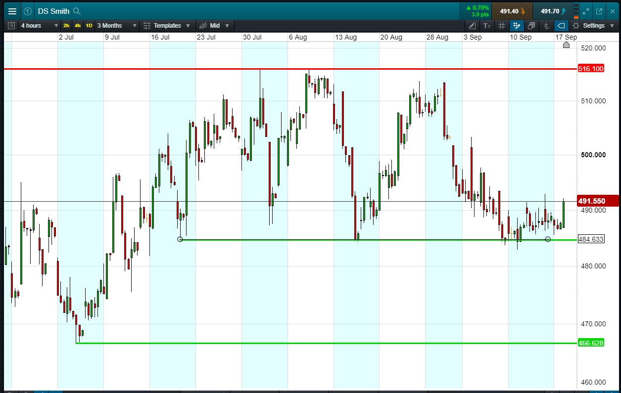 Let’s say you like the range, you think it’s heading back towards 516p again. You decide to buy exposure to £10,000 worth of DS Smith using a CFD, at the current price of 491p. To do this, you need £2,000.