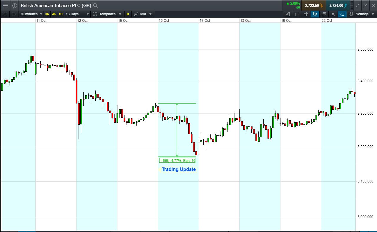 - The chart shows the price movement last time British American Tobacco reported (Q3 Trading Update, 16 Oct).