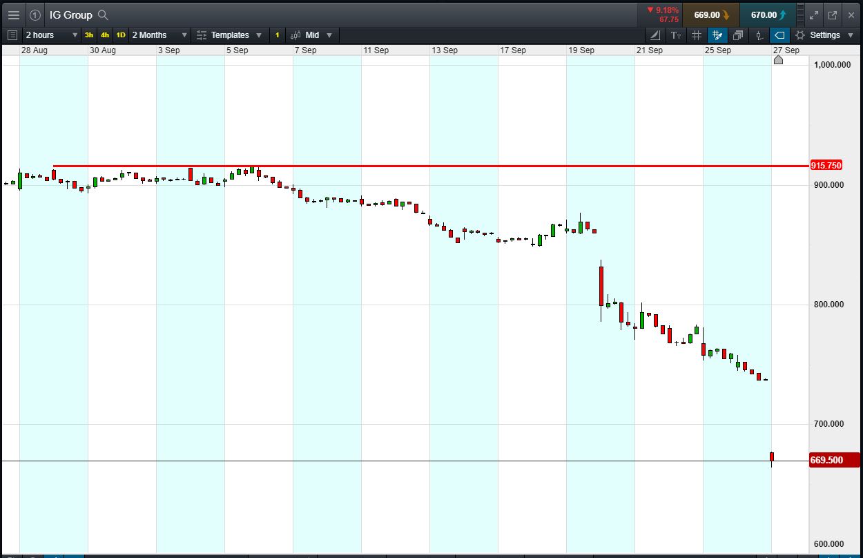Let’s say you feel that the stock is a bargain and you think could bounce back towards September high of 915p. You decide to buy exposure to £10,000 worth of IG Group using a CFD, at the current price of 669p. To do this, you need £2,000.