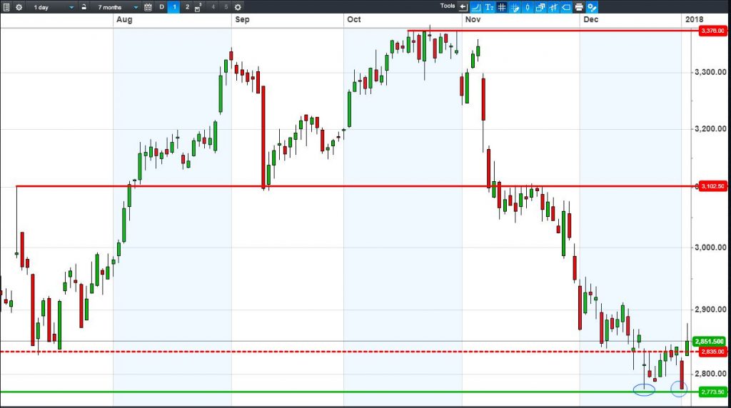 • Will the price fall towards lows of 2773p (-2.7%)? or;