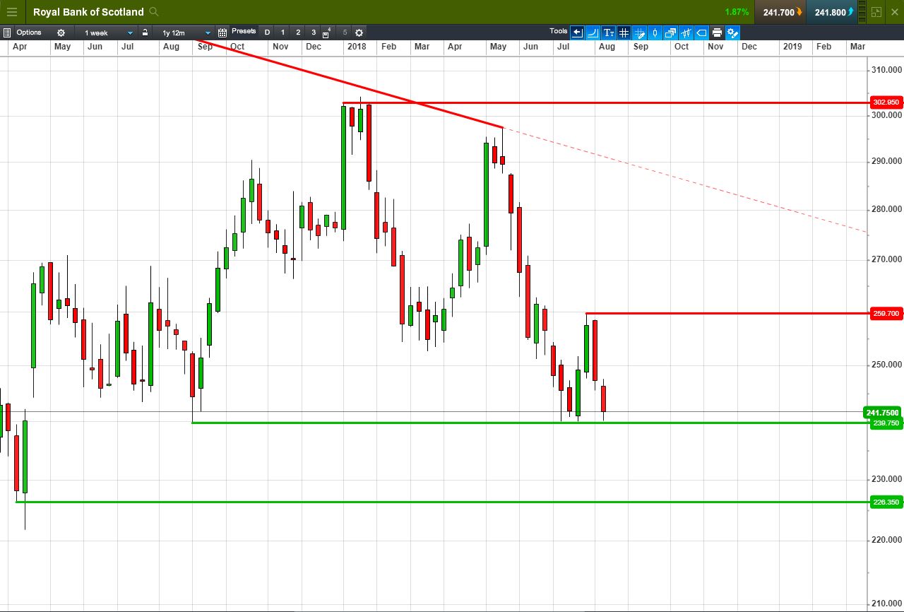 • Will the price fall towards lows of 226.35p (-6.4%)? or;