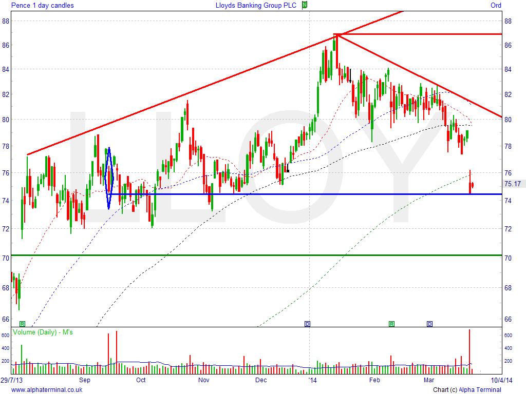 • Potential support: September 2013 post government stake-sale lows of 74.5p
