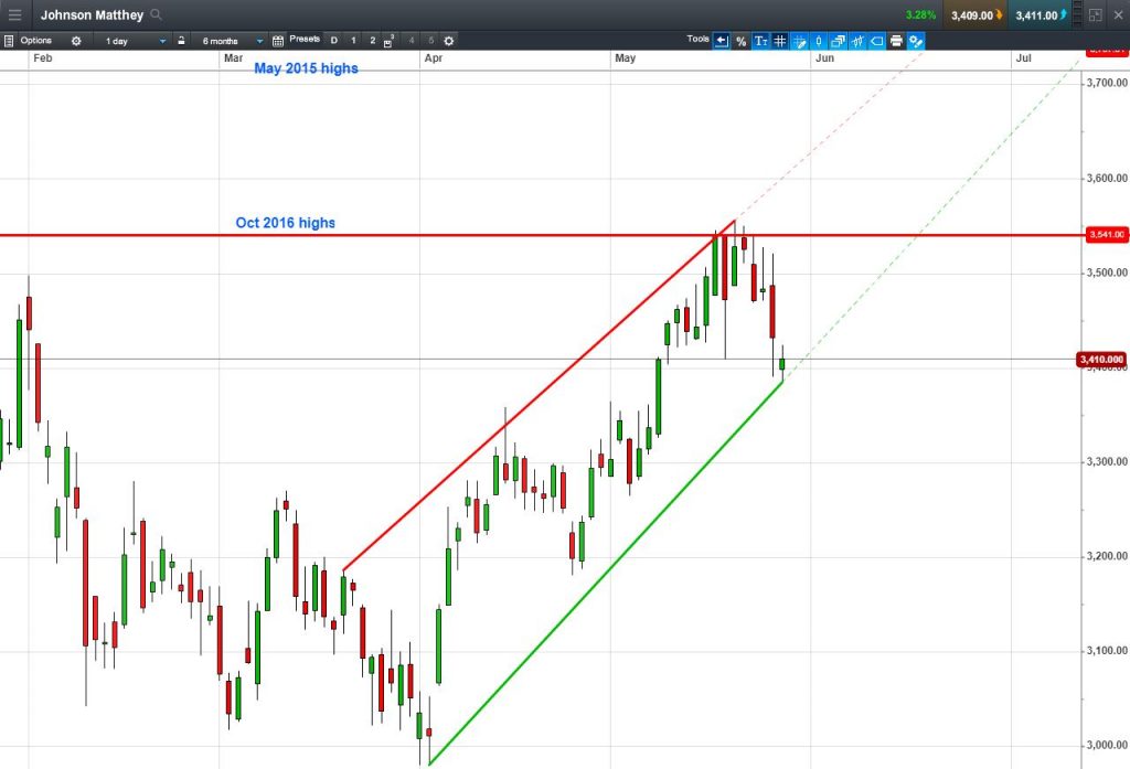 • Will the price fall towards lows of 3278p (-4%)? or;