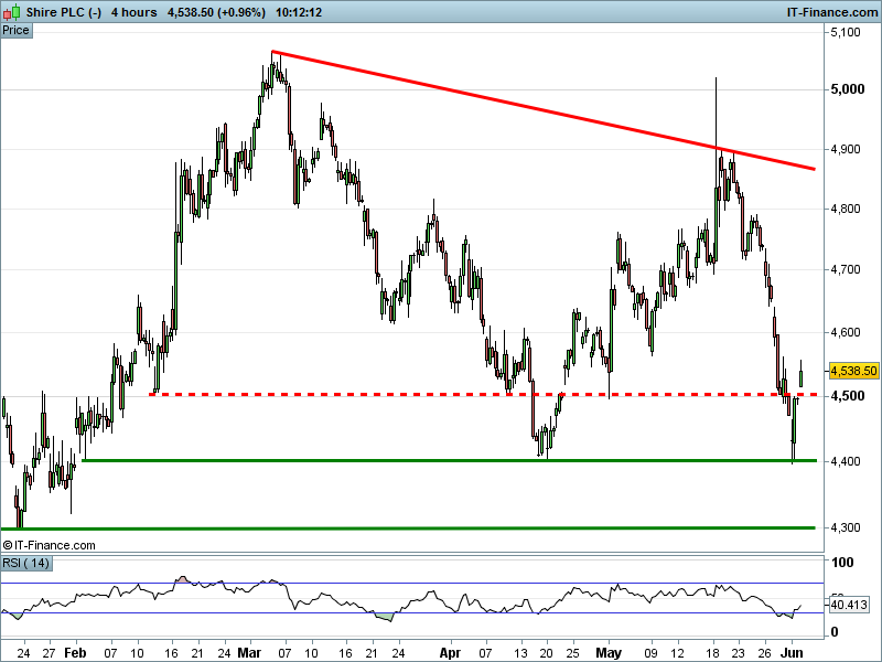 1. Will the price fall towards lows of 4300p (-5.1%)? or;
