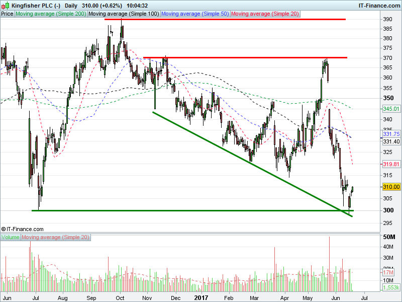 1. Will the price fall towards lows of 300p (-3.2%)? or;