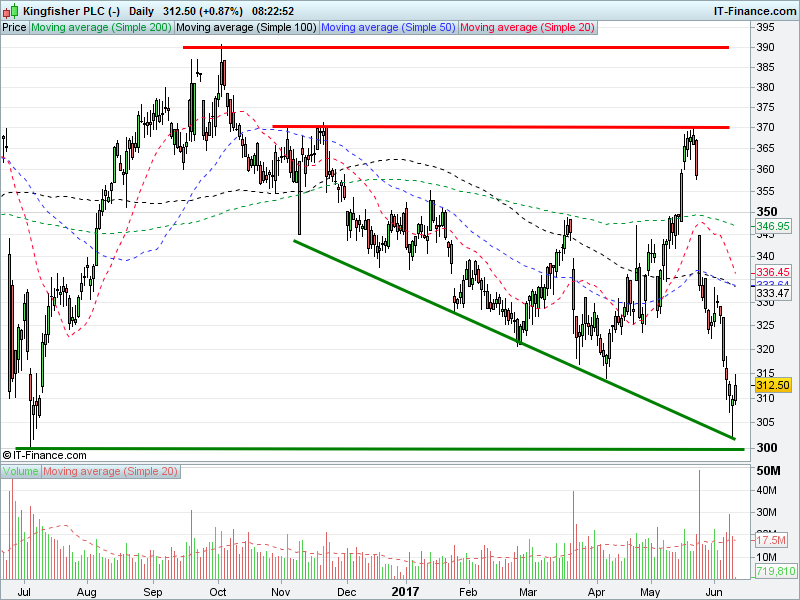 1. Will the price fall towards lows of 300p (-4.0%)? or;