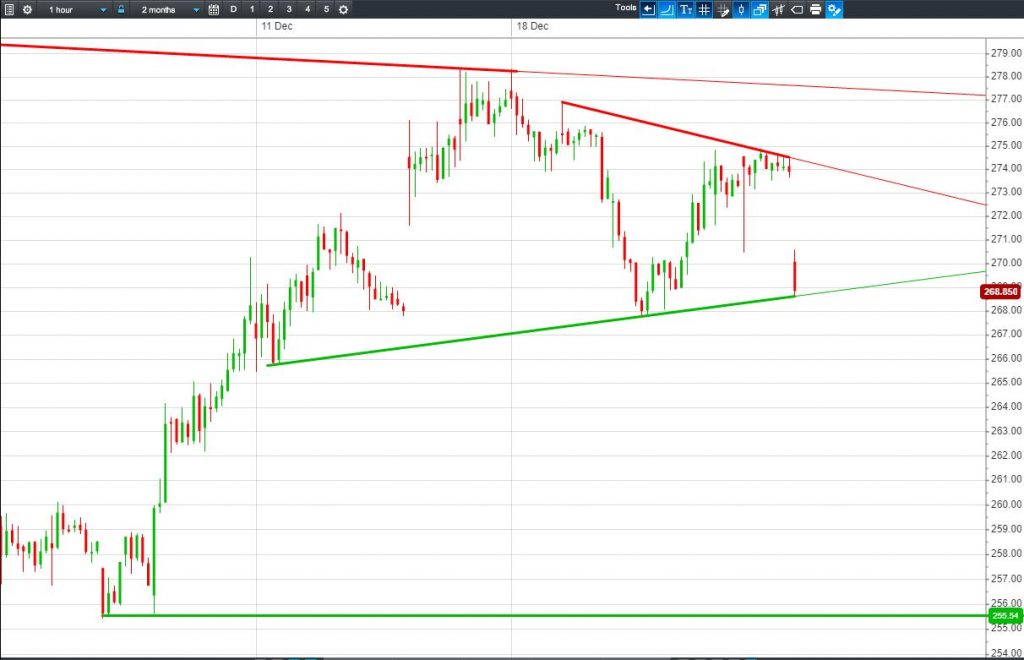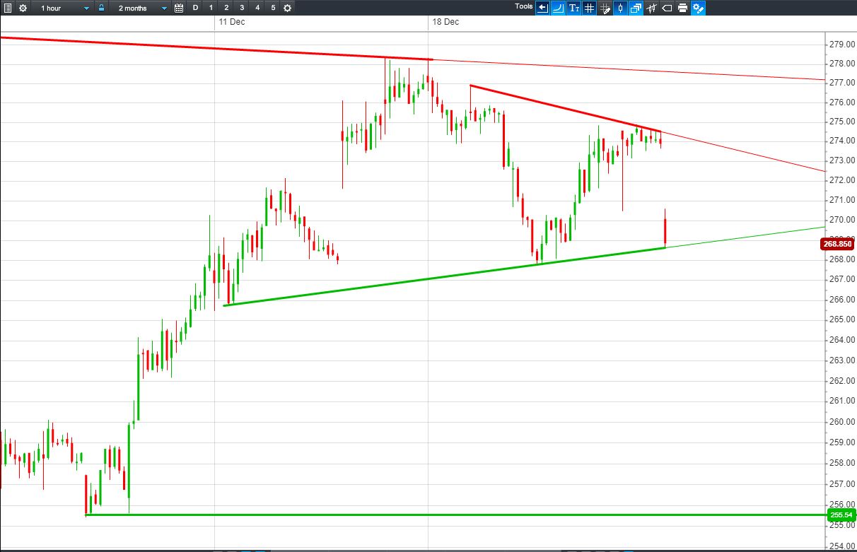 • Shares testing rising lows support around 268.5p