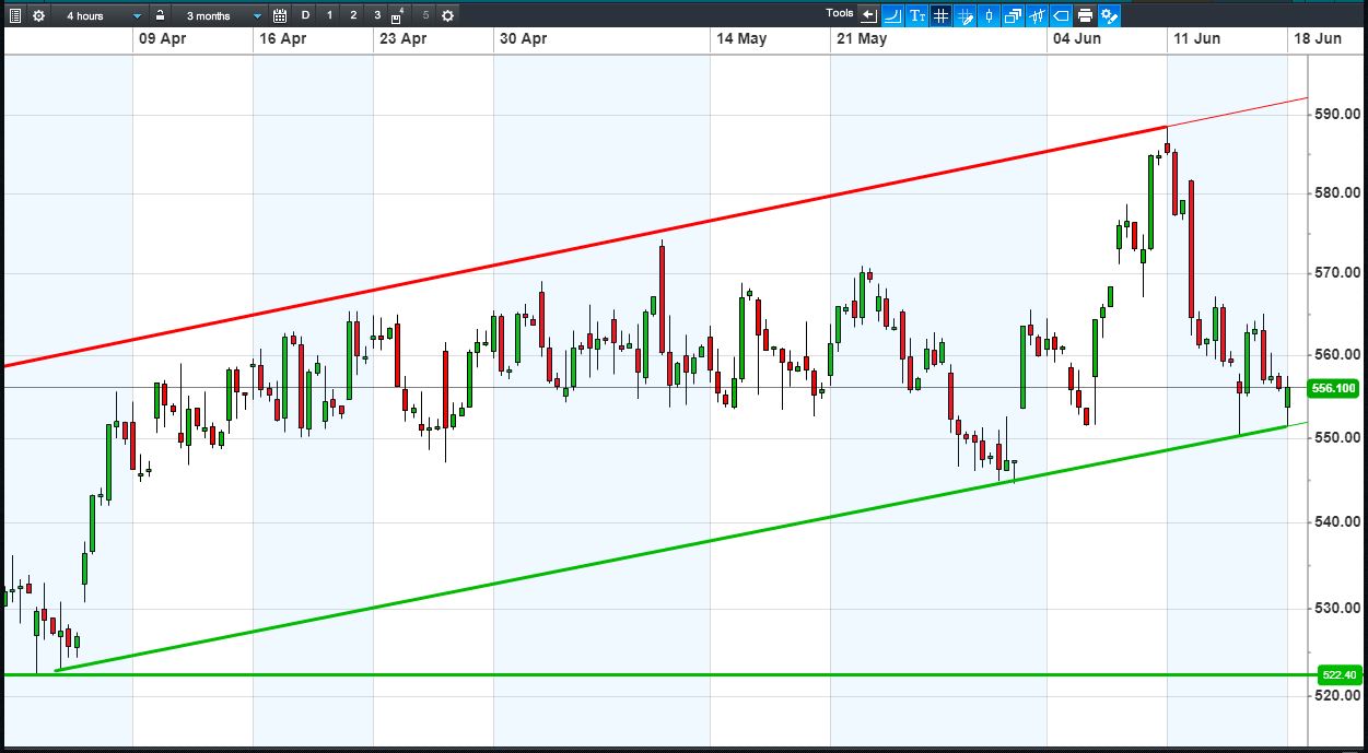 • Will the price fall towards lows of 522.4p (-6.1%)? or;