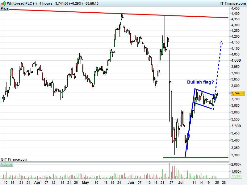 1. Will the price fall towards lows of 3300p (-12%)? or;
