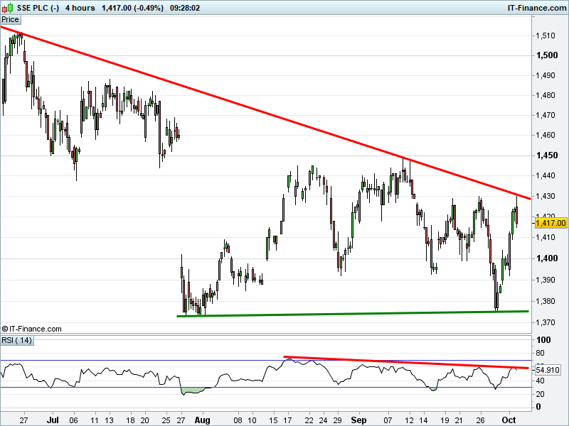 • Will the price rise towards highs of 1500p (+5.9%)? or;