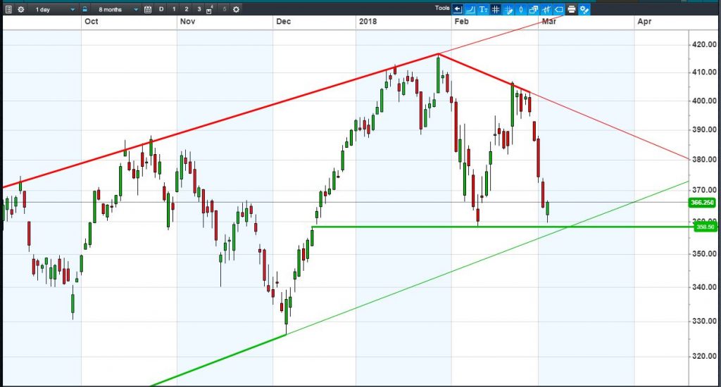 • Will the price fall towards lows of 330p (-9.9%)? or;