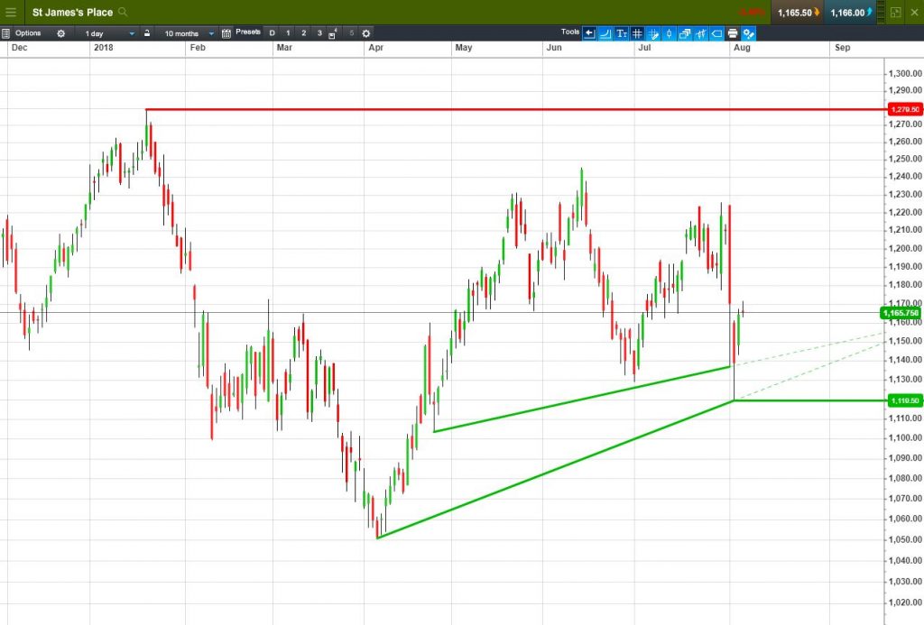 • Will the price fall towards lows of 1119p (-4.0%)? or;