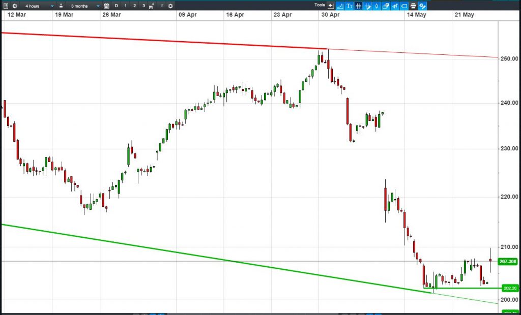 • Will the price fall towards lows of 200p (-3.5%)? or;