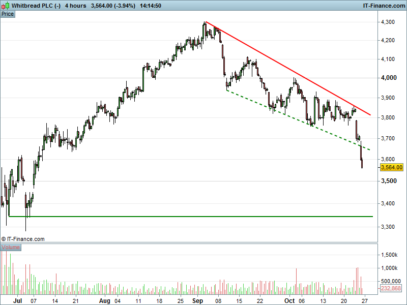 2. Will the price fall towards lows of 3345p (-6%)?