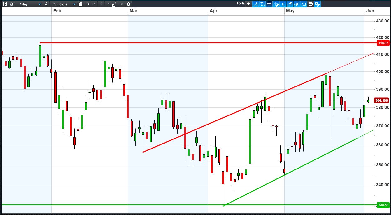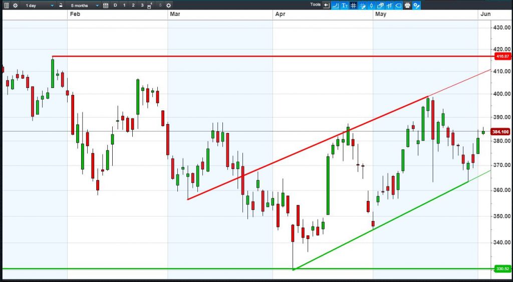 • Will the price rise towards highs of 416.8p (+8.5%)?