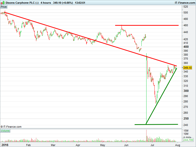 1. Will the price fall towards lows of 240p (-31%)? or;
