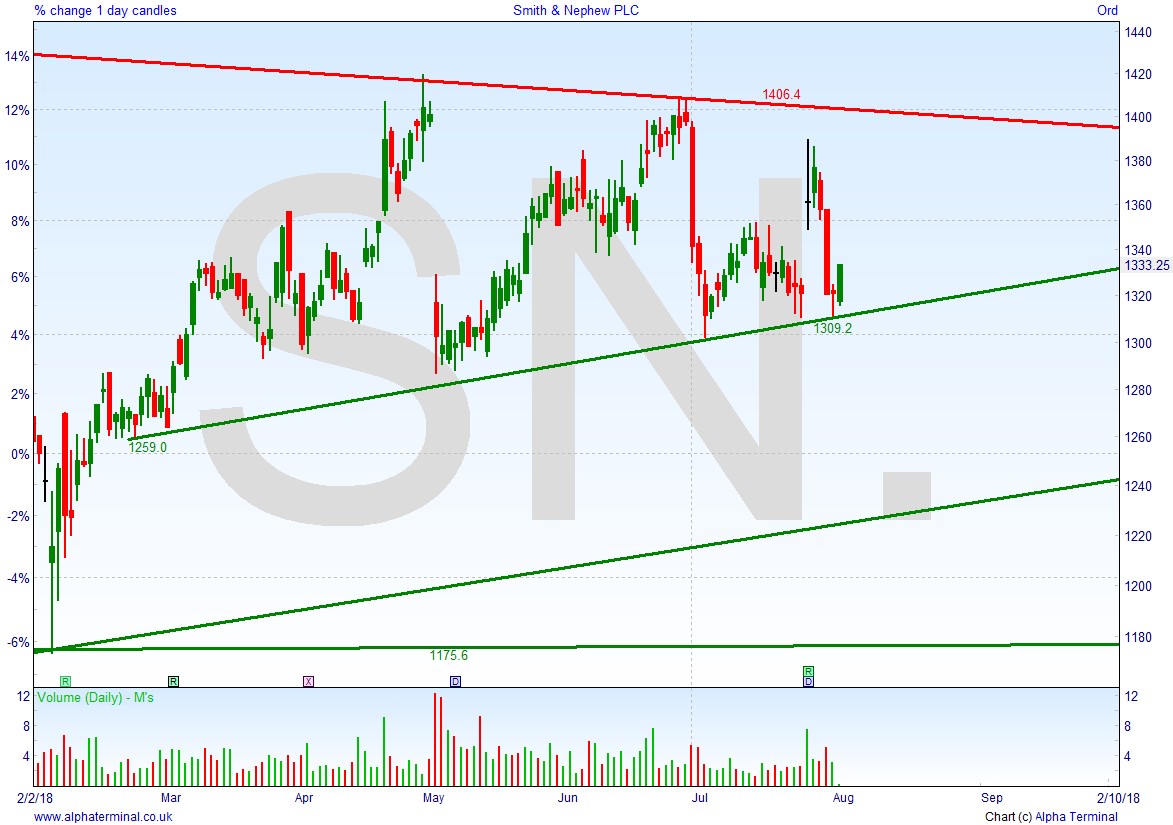 • Will the price fall towards lows of 1300p (-2.5%)? or;