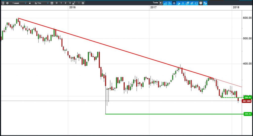 • Will the price fall towards lows of 256p (-11.1%)?