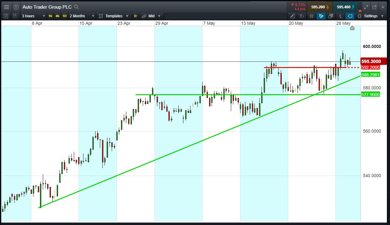 Conversely, let’s assume you open the above position, and place a stop-loss at 3% from the current price. Auto Trader breaks lower, falling 3% and it hits your stop-loss. Your loss would be £300.