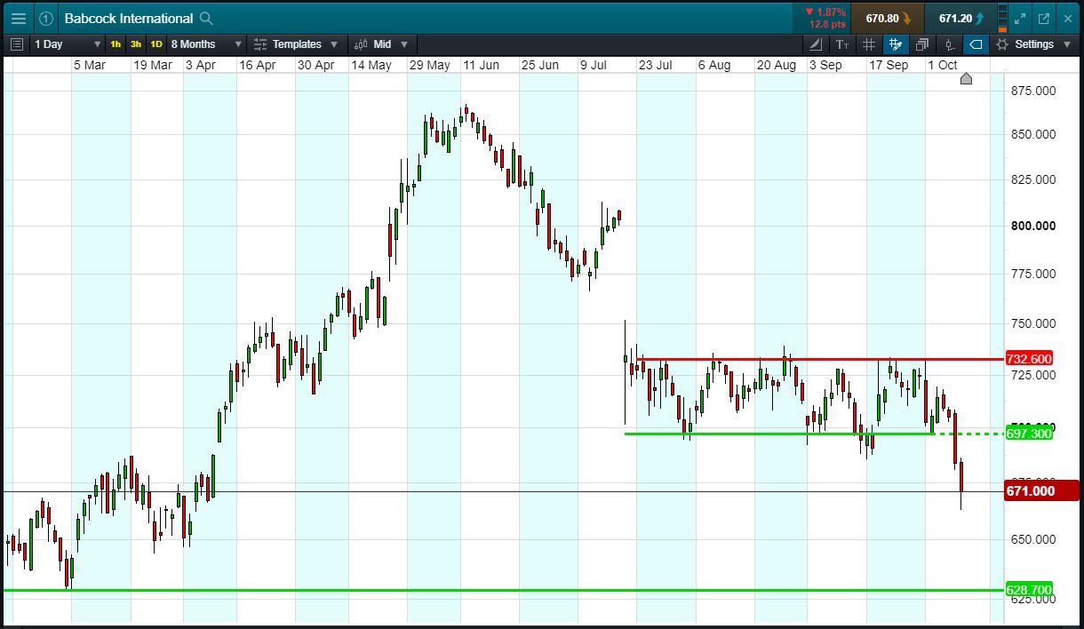 Let’s say the breakdown appeals to you, you think it’s likely to continue. You decide to sell exposure to £10,000 worth of Babcock using a CFD, at the current price of 670p. To do this, you need £2,000.