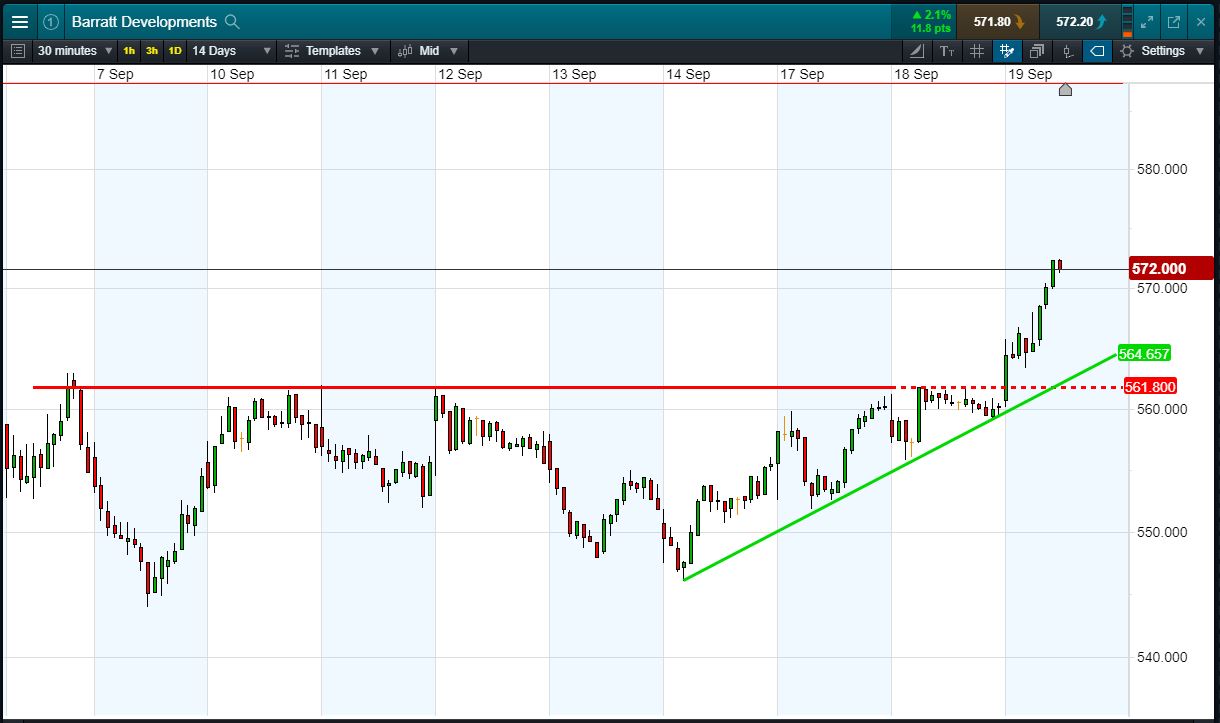 Let’s say the breakout appeals to you, you think it’s likely to continue. You decide to buy exposure to £10,000 worth of Barratt Developments using a CFD, at the current price of 572p. To do this, you need £2,000.