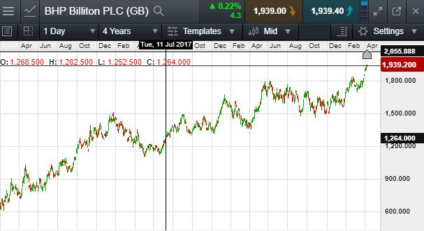 Let’s assume the BHP trend continues to highs of 2097p (+13.3%). Your profit would be £1330, from your initial investment of £2,000.