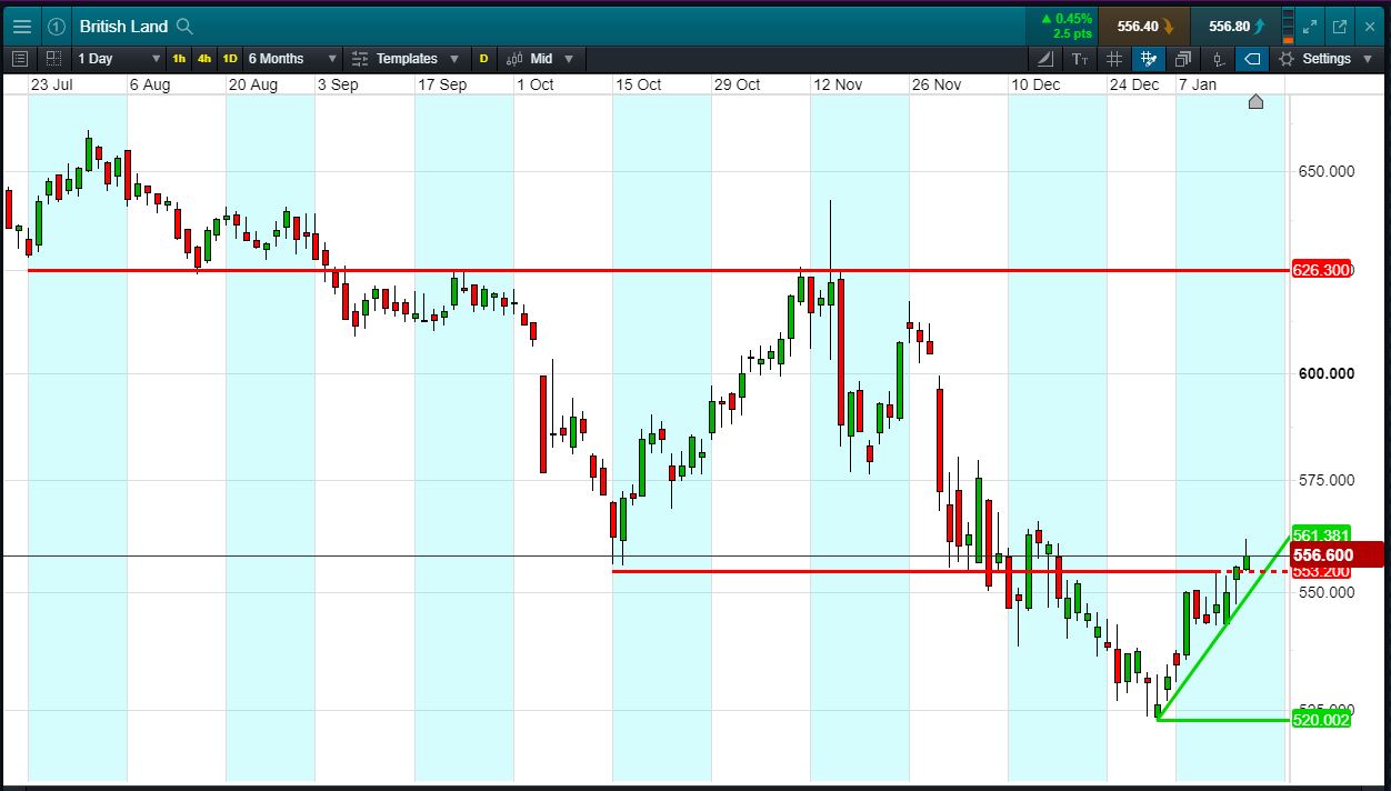 - The shares are testing a resistance line at 553p; Now trading 557p (at time of writing).