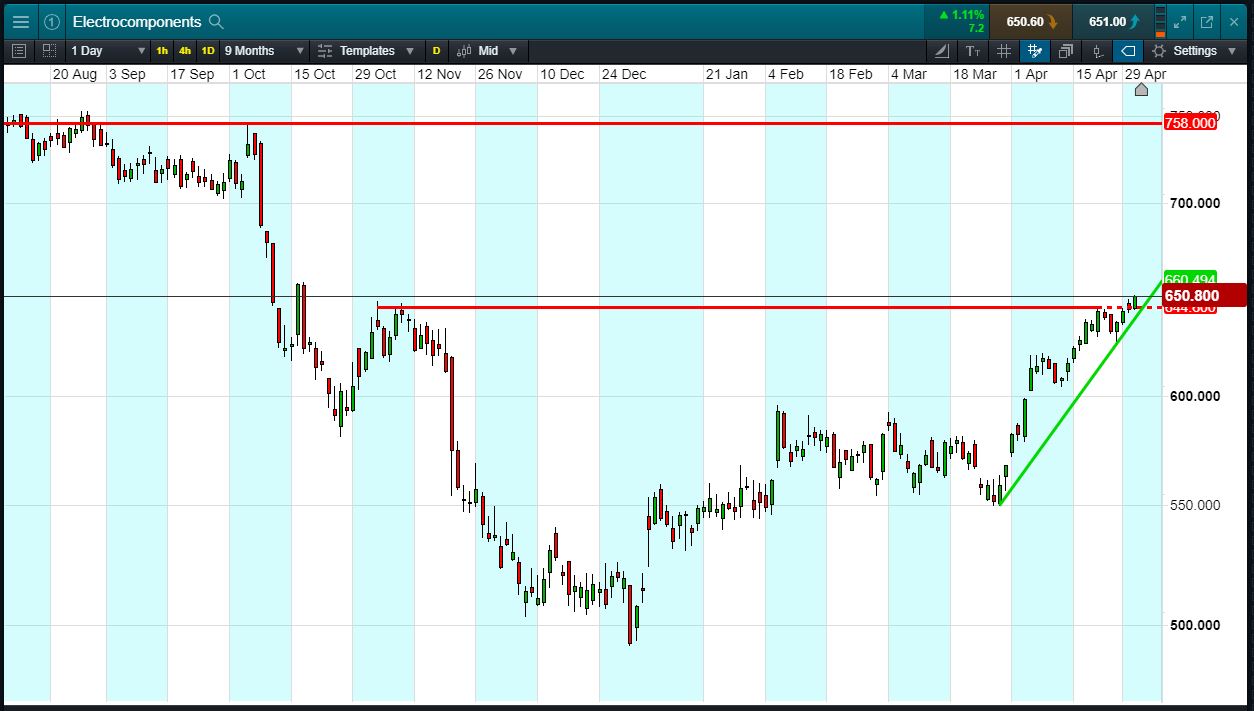 Will Electrocomponents turn, or will it continue to rise towards 758p?