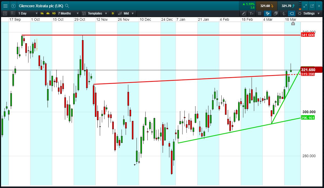 Let’s say the breakout appeals to you, you think it’s likely to continue towards 341p. You decide to buy exposure to £10,000 worth of Glencore using a CFD, at the current price of 321p. To do this, you need £2,000.