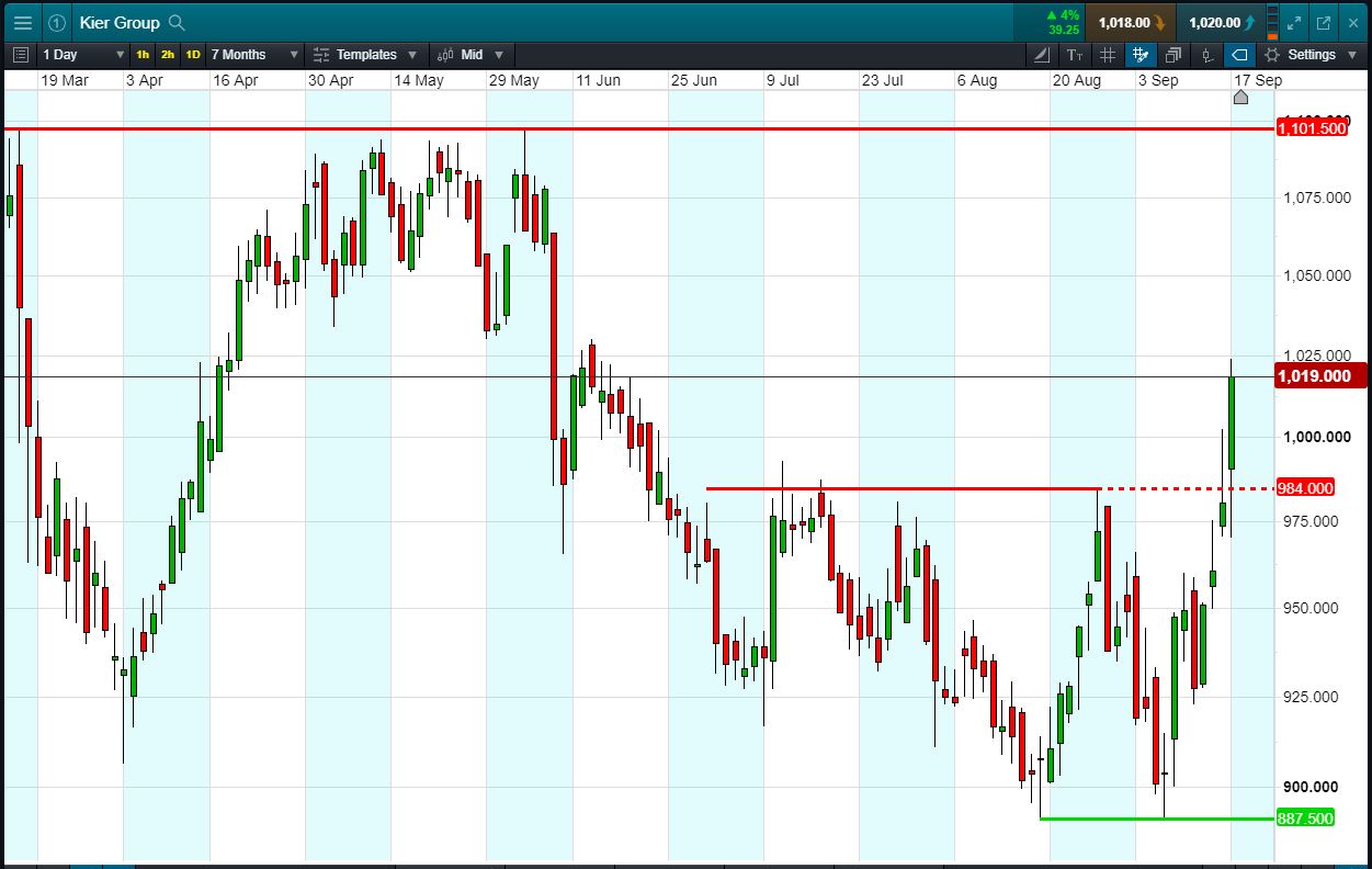 Let’s say the breakout appeals to you, you think it’s likely to continue. You decide to buy exposure to £10,000 worth of Kier Group using a CFD, at the current price of 1019p. To do this, you need £2000.