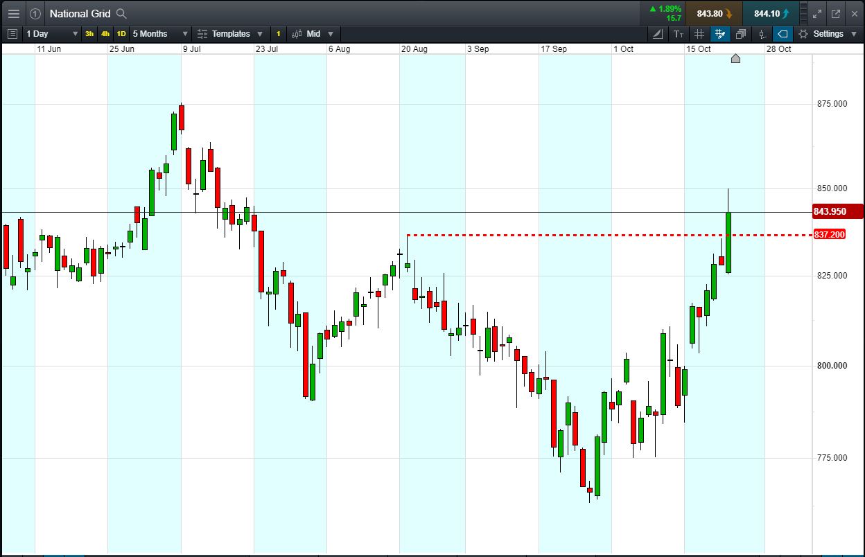 Let’s say the breakout appeals to you, you think it’s likely to continue. You decide to buy exposure to £10,000 worth of National Grid using a CFD, at the current price of 843p. To do this, you need £2,000.