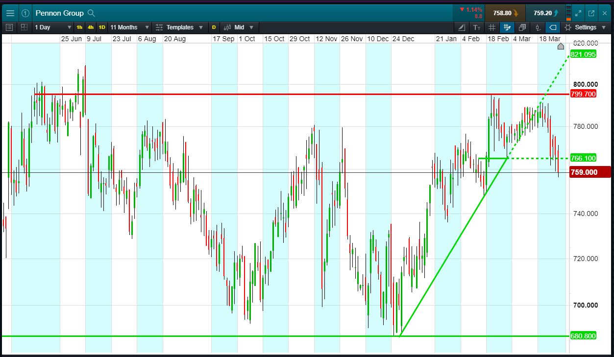 Let’s say the breakdown appeals to you, you think it’s likely to continue to 680p . You decide to sell exposure to £10,000 worth of Pennon using a CFD, at the current price 759p (at time of writing). To do this, you need £2,000.