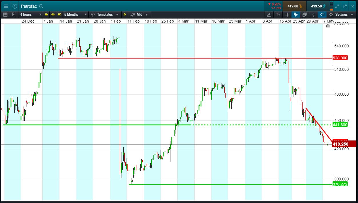 Will Petrofac turn, or will it continue to fall towards 376p?