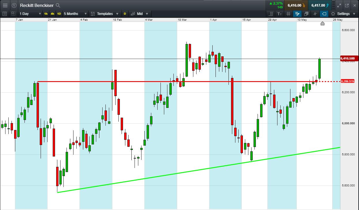 Let’s say the breakout appeals to you, you think it’s likely to continue. You decide to buy exposure to £10,000 worth of Reckitt Benckiser using a CFD, at the current price of 6416p. To do this, you need £2,000.