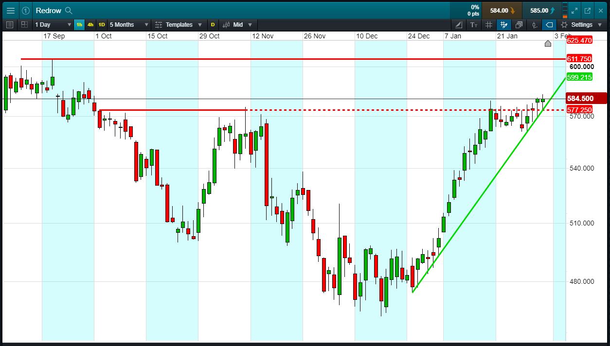 • The ‘trend is your friend’. Will it continue towards 611p?
