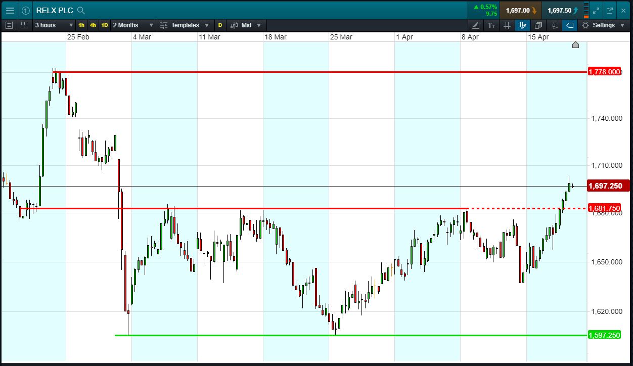 Let’s say the breakout appeals to you, you think it’s likely to continue to 1778p . You decide to buy exposure to £10,000 worth of RELX using a CFD, at the current price 1697(at time of writing). To do this, you need £2,000.
