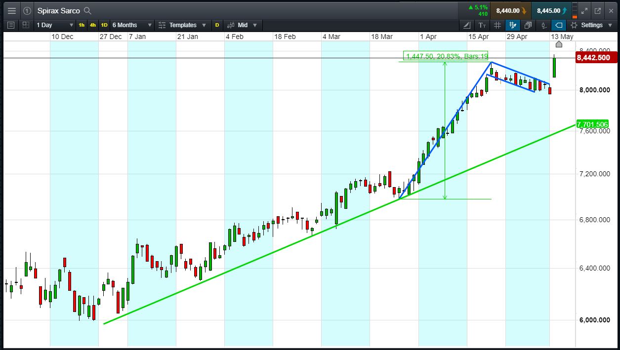 Conversely, let’s assume you open the above position, and place a stop-loss at 5% from the current price. Spirax Sarco breaks lower, falling 5% and it hits your stop-loss. Your loss would be £500.