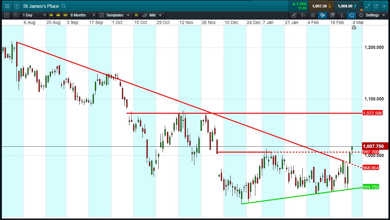Will St James’s Place turn, or will it continue to rise towards 1072p?