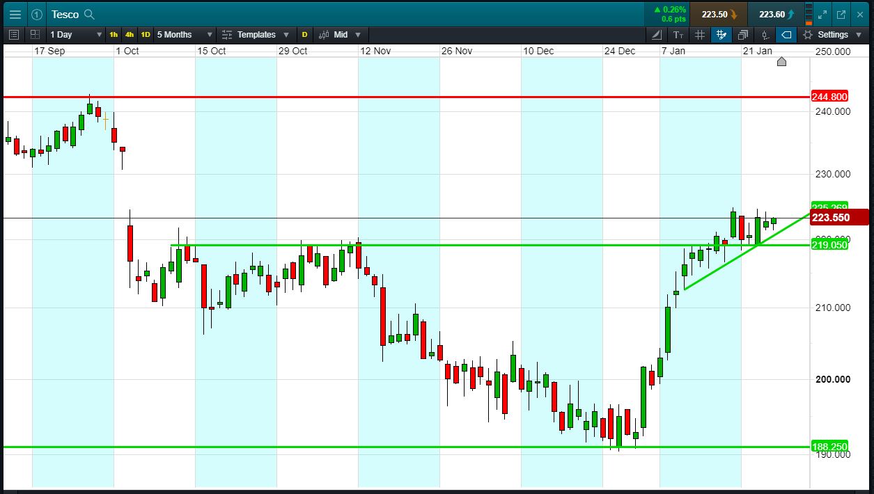 - Breakout above resistance at 219p to trade 223.5p (at time of writing).