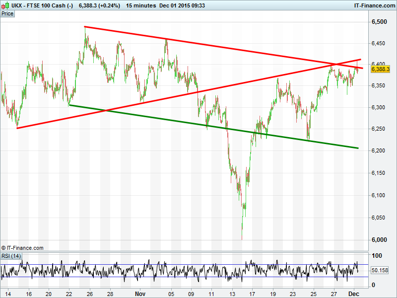 UK 100 tried again to get above 6400, and to be fair it did better than last time. However, it remains hindered by a pair of resistance trendlines around 6400. Will falling highs hold the index back, or will the intersecting trendline from mid-October allow for minor tests higher?
