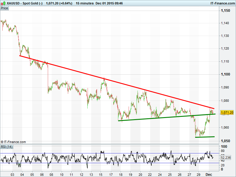 UK Index tested but failed again at 6400. DAX still testing 9-month intersecting resistance around 11400. Wall St still held back by 6-month shallow falling highs 17890. Gold bounced of $1053 to test 3-week falling highs at $1075.