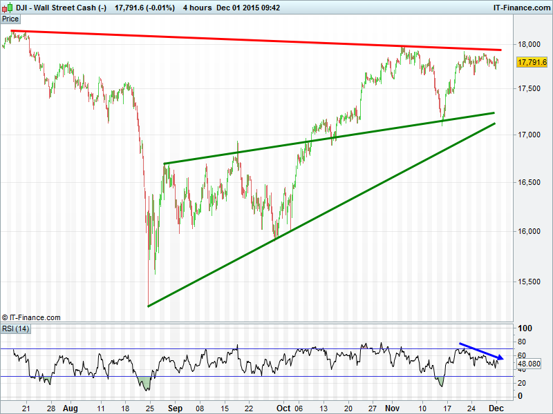 US Dow Jones futures still stifled by July shallow falling resistance at 17900. Flat index versus falling RSI means negative divergence with price. Index set for a pullback?