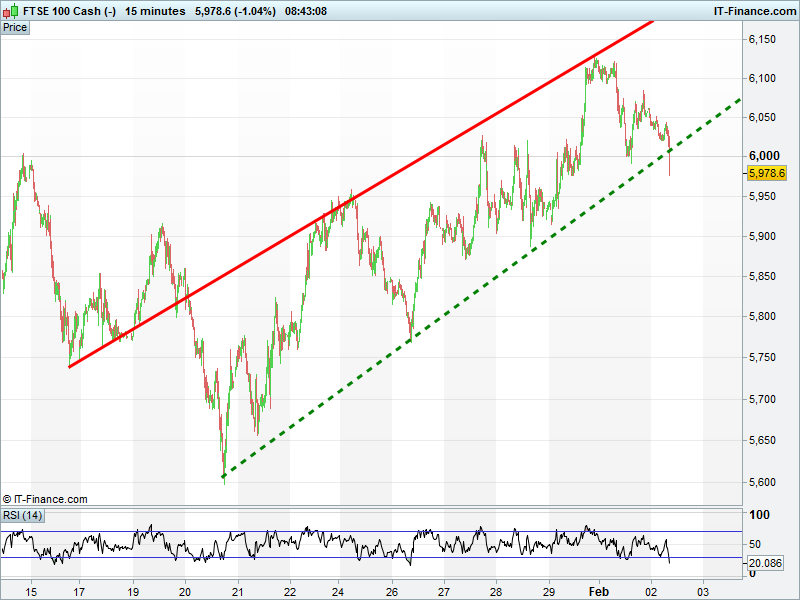UK 100 broken below 6000, potentially putting recent uptrend at risk. DAX testing shallow rising support at 9640. Wall St sideways around 16300, off ceiling of rising channel. Gold at $1125 apex of 2-month rising and 8-month falling trends.