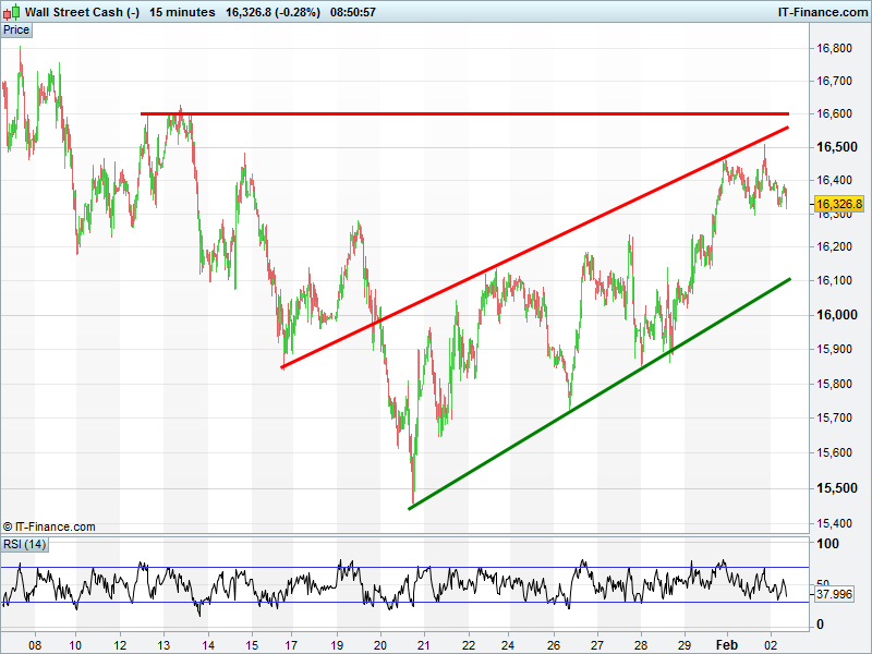 US Dow Jones still in rising channel but sideways off the ceiling. Holding above 16300 for now although a retrace to 16200 wouldn’t harm the uptrend reversal.