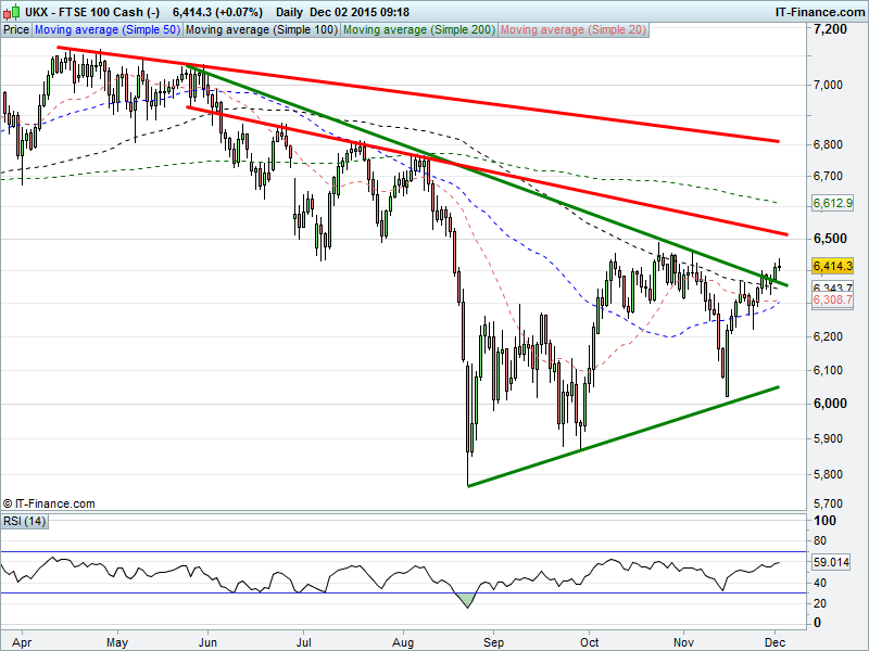 UK 100 broken above 6400 to clear 6-month falling highs resistance. This keeps the uptrend alive and means a revisit of Oct highs 6490 and 5-month falling highs 6500 is possible.
