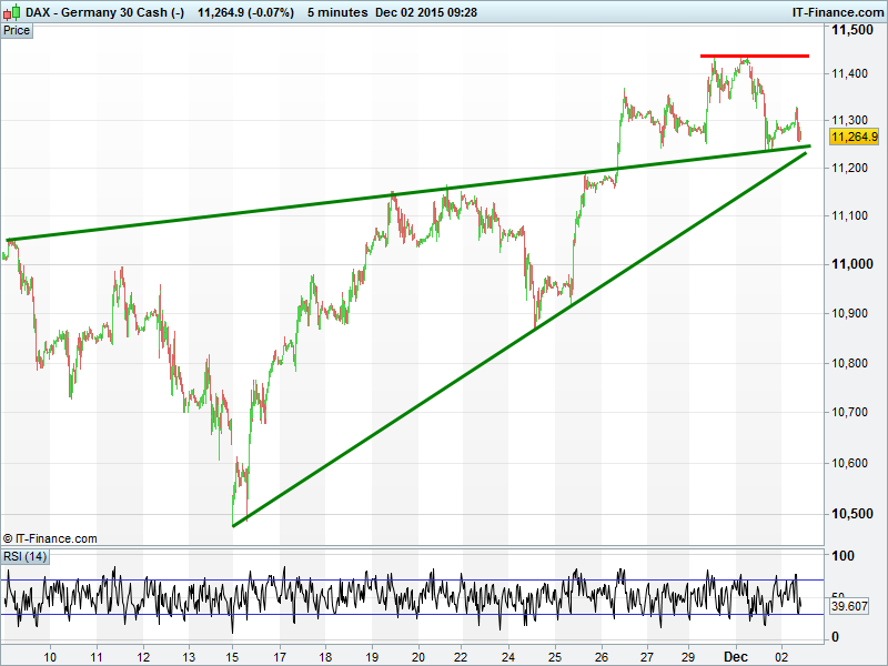 Germany’s DAX unable to break above to major trend-line of resistance at 11400. Still in uptrend, helped by prospect of further ECB stimulus, but worries about Draghi disappointing have taken the shine off recent gains. Decent twin support at 11250