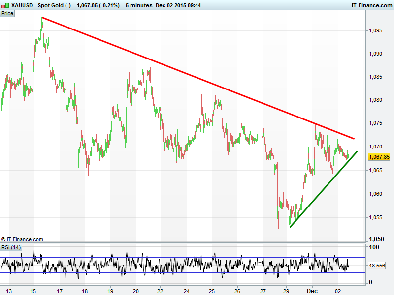 Gold’s off its recent lows but bulls still facing stiff competition from the long term bears which have had it in a solid downtrend since September 2012. Nearing apex of narrowing pattern offers potential for a break, however, as a continuation pattern the assumption would be downward unless the USD pulls back hard or safehaven seeking rises.