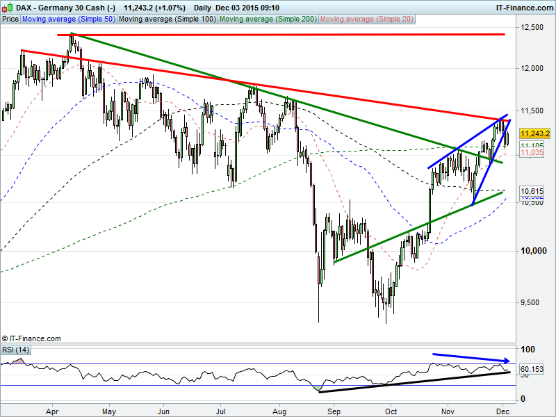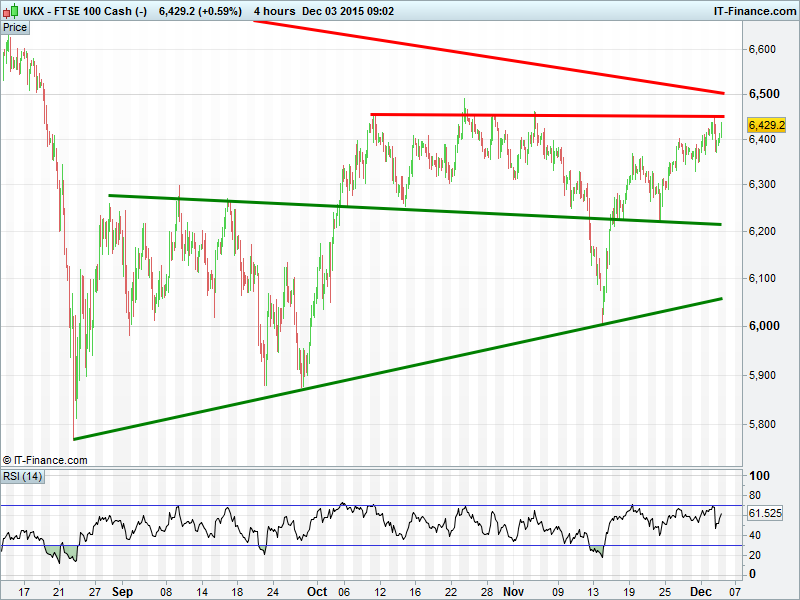UK Index  rallying back to make another attempt towards 6450. DAX held back by resistance at 11400 and possibly breaking down from bearish rising wedge. Wall St still hindered by 17900 resistance, in sideways range. Gold downtrend taken it back to levels last seen in Feb 2010.