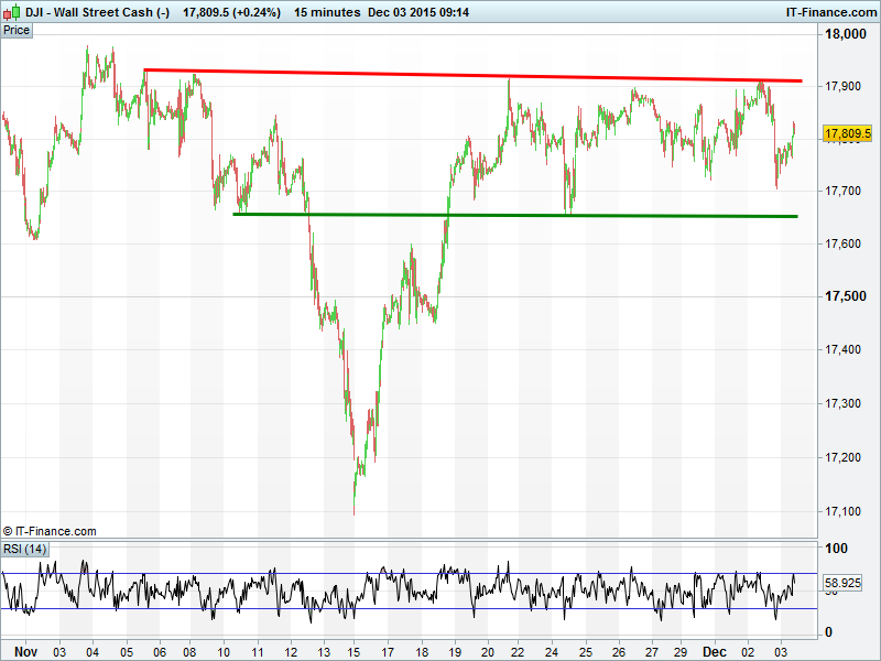 US Dow Jones futures still trading sideways in 17700-17900 range, unable to break above early November resistance. Falling lows means potential for revisit of recent 17650 lows while blocked by horizontal highs.