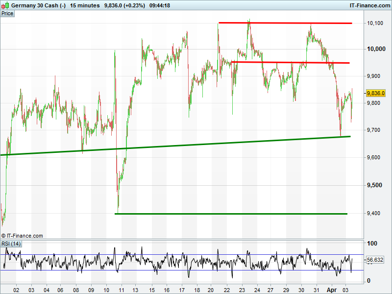 DAX still trying to make headway from Friday’s bounce off 9670 intersecting March support. While 9850 has been tested, the index remains under pressure following its rollover from a bearish double failure to break out at at 10100 and break of Feb rising support at 9900.